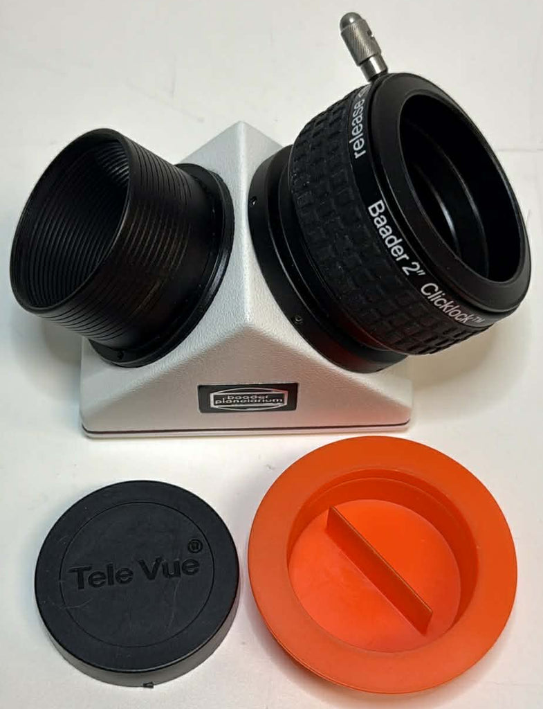 This is a used Baader 2" diagonal with click-lock in very good condition. The optics are reasonably clean, with some minor dust that will not significantly affect your views.  We have discounted the item appropriately to reflect this condition issue.  The body is free of any marks or scratches. This includes both dust caps but does not come in a box.